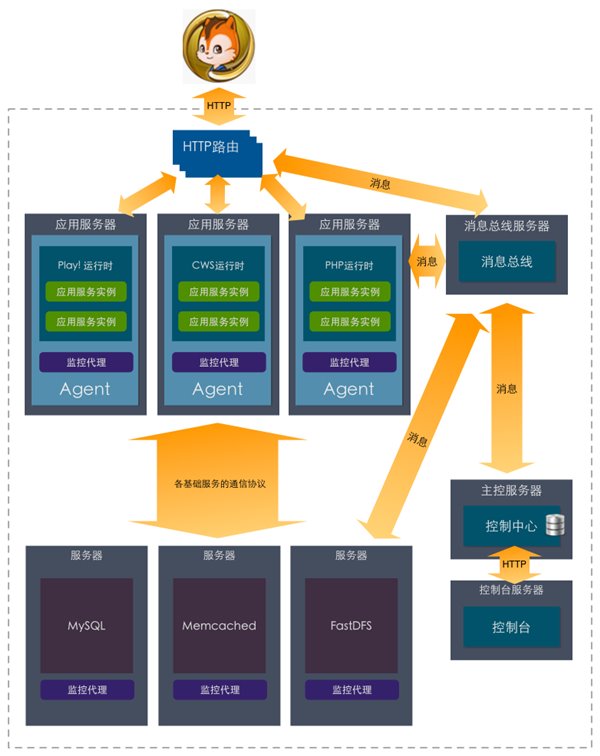 基于软件包的交付解决之后,我们希望交付的粒度更大,如何实现全应用(从应用的前端接入到后端存储)的交付,此时便有了PAAS平台和基于应用架构的可视化部署服务两种方案。这两种实现思路有很大的不同,我们知道完整的PAAS平台提供了对底层公共服务的向上API统一抽象,比如说数据库服务、存储服务、Cache服务。PAAS平台经典的实现应该是Cloud Foudry了,国内很多PAAS平台基本上都是参考CF来实现的。阿里UC也有一个类似的PAAS平台,示意图如下。