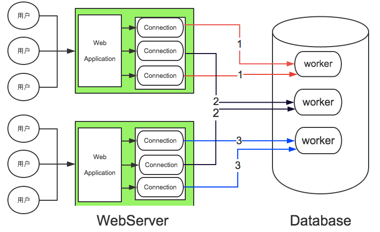 连接池通常实现在Client端,是指应用(客户端)创建预先创建一定的连接,利用这些连接服务于客户端所有的DB请求。如果某一个时刻,空闲的连接数小于DB的请求数,则需要将请求排队,等待空闲连接处理。通过连接池可以复用连接,避免连接的频繁创建和释放,从而减少请求的平均响应时间,并且在请求繁忙时,通过请求排队,可以缓冲应用对DB的冲击。线程池实现在server端,通过创建一定数量的线程服务DB请求,相对于one-conection-per-thread的一个线程服务一个连接的方式,线程池服务的小单位是语句,即一个线程可以对应多个活跃的连接。通过线程池,可以将server端的服务线程数控制在一定的范围,减少了系统资源的竞争和线程上下文切换带来的消耗,同时也避免出现高连接数导致的高并发问题。连接池和线程池相辅相成,通过连接池可以减少连接的创建和释放,提高请求的平均响应时间,并能很好地控制一个应用的DB连接数,但无法控制整个应用集群的连接数规模,从而导致高连接数,通过线程池则可以很好地应对高连接数,保证server端能提供稳定的服务。如图2所示,每个web-server端维护了3个连接的连接池,对于连接池的每个连接实际不是独占db-server的一个worker,而是可能与其他连接共享。这里假设db-server只有3个group,每个group只有一个worker,每个worker处理了2个连接的请求。