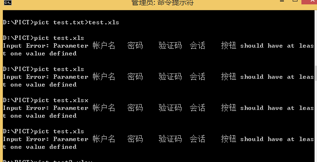 2、打开开始-运行,输入CMD进入命令提示符。输入命令cd D:PICT 进入工作目录。输入pict test.txt 命令输出结果。也可以将结果输出到excel文档中。如图所示: