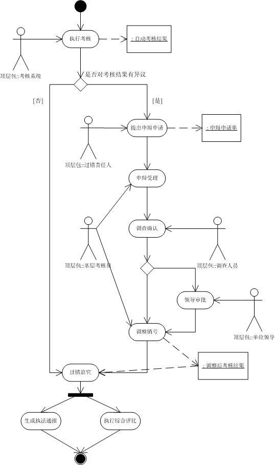 这张图才是我爱使用的行动图。图中,将参与者由繁琐的泳道改为了用例图中的小人。同时,在这张图中还增加了对象流与对象。图中,自动考核结果、申辩申请单、调整后考核结果,都是数据对象,是该流程中相关环节操作的结果。从活动节点指向对象的虚线箭头,则表示了一个对象流,如“申辩申请”活动指向“申辩申请单”的虚线箭头,表示了申辩申请活动的终结果是产生申辩申请单;从“调整后考核结果”指向“过错追究”的虚线箭头,表示过错追究活动读取了调整后考核结果。