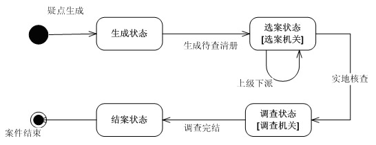在使用状态图时,一个非常关键的概念是,一定是对某个关键对象的状态变化的描述,而这些状态变化一定是在某个业务流程的大背景下进行的。下图是一个疑点数据整个生命周期的状态变化图。图中,与行动图一样,一个实心圆点代表的是流程的开始,圆边的方框代表的是对象生命周期中的各个状态,状态节点间的实线箭头代表的是状态的切换,箭头的文字描述是触发状态切换的事件。与行动图一样,状态图可以有分支、分岔、汇合,并后以一个或多个带环的实心圆结束,代表对象生命周期的终结。