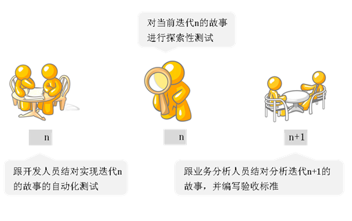 QA通常不是仅仅工作在某个迭代,而是并行的同时工作在多个迭代:要对当前迭代的故事进行验收测试、探索性测试,和开发人员结对实现测试自动化;还要和业务人员结对分析下一个迭代的故事,编写验收标准和测试用例。