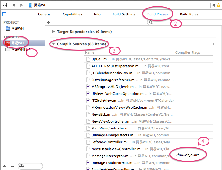 在ARC的项目中,对MRC的文件可以添加编译选项-fno-objc-arc的标识;在MRC的项目中,对ARC的文件可以添加编译选项-fobjc-arc的标识。步骤如下图所示。