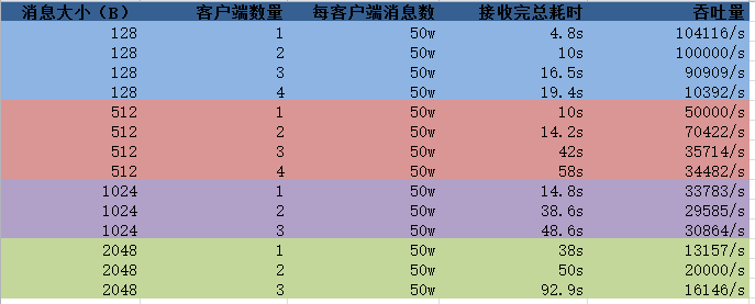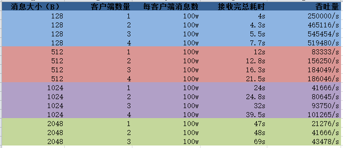 大家可以看到,当消息大小为1K时,客户端机器4个进程同时发送,服务端机器全部接收完用时39.5s,也是每秒101265接近网卡的极限。为什么没有达到网卡的极限,其实可以到达只要我开6个进程发送消息即可。只是我上面为了方便对比,每个消息大小多开4个进程。