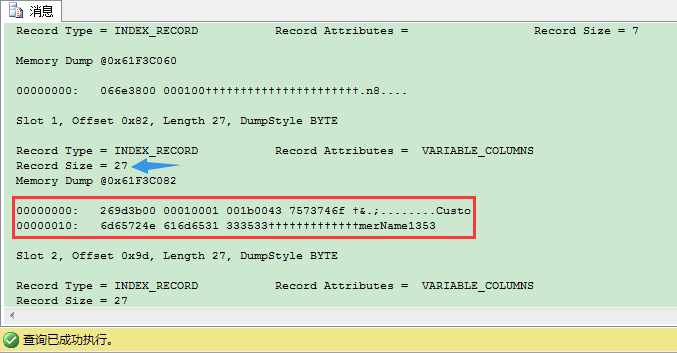 1b00 这2个字节代表每个变长列结束为止的偏移量。每个变长列需要2字节。这个和在数据页里存储变长列一致。这里我们有1个变长列,因此SQL Server需要1个 2 byte的偏移量——27 byte的偏移量。这是说下一个字节一直到27 byte的偏移量都是我们变长列(聚集键)的组成部分。
