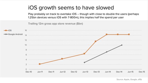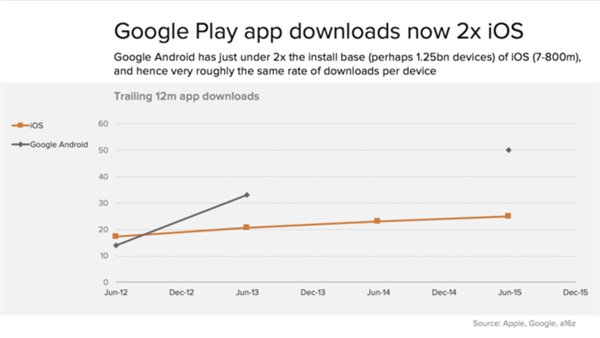 去年夏季,苹果和谷歌分别在各自的开发者大会上公布了其应用商店向开发者支付的款额:Google Play在过去12个月里支付了50亿美元,iOS App Store则支付了100亿美元。Android用户数量是iOS的两倍,这等于说平均每个iOS用户在应用上的支出是Android用户大约4倍多。