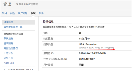 安装请参考:http://blog.csdn.net/mchdba/article/details/39441871,确定java环境为1.7系列,安装好Jira后,登陆进入系统,点击右上角齿轮形状的管理图标,选择“系统”,再选择“授权”,看到使用日期不到1个月,如下所示: