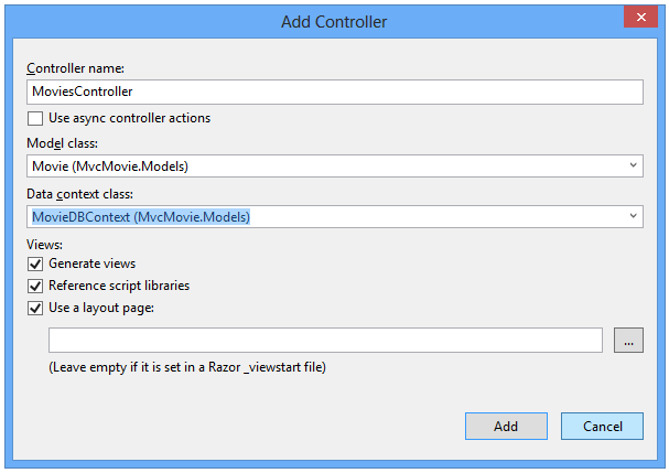 3.添加一个控制器,选择刚才我们创建的Model作为模型(即创建强类型视图)
