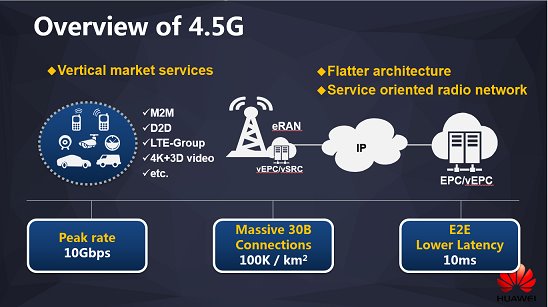 4.5G是4G和5G的过渡技术。相对目前运营商普遍部署的4G网络而言,4.5G网络将在带宽、网络容量、时延等方面获得提升。具体来说,可以实现随时随地的100Mbps连接速度,网络时延将从目前4G的几十毫秒缩短到10毫秒,并能支撑300亿量级的连接数。