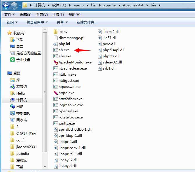 打开Apache服务器的安装路径(我用的是 WampServer),在bin目录中有一个ab.exe的可执行程序,它是要介绍的压力测试工具。