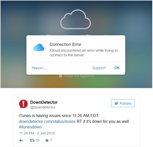 美国、加拿大和其他的多个iCloud服务目前正在经历宕机。问题在一个小时内已经影响了大范围的用户。很多用户在社交网络上抱怨,自己无法登陆iCloud以及相关服务,比如邮件和查找iPhone。iTunes也从美国太平洋时间早晨8点半开始遇到问题,目前苹果还没有更新系统状态页面,反映受影响的服务。