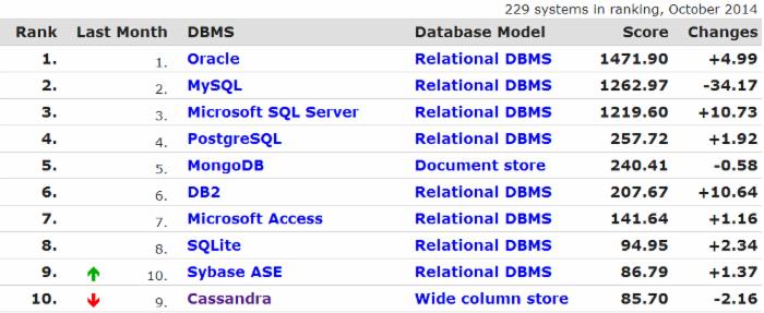 NoSQL非常年轻,但他拥有的众多的特性已经让众多企业和开发者开始接受,让我们来看一下来自于美国数据库知识网站DB-engines上个月的数据库排名情况。