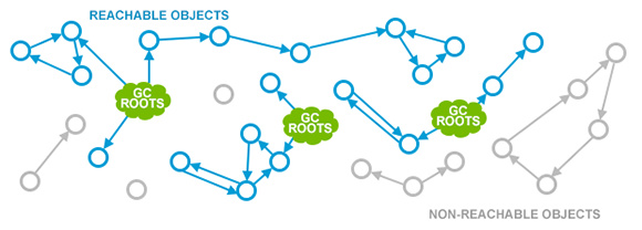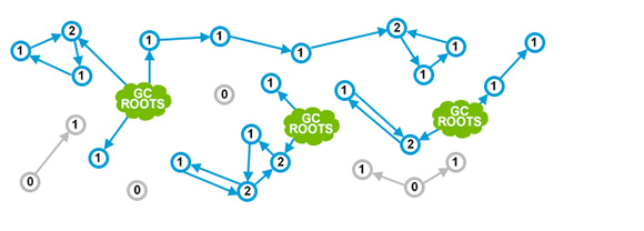 有几种方法可以解决这一问题,比如说使用特殊的“弱”引用,或者使用一个特殊的算法回收循环引用。之前提到的Perl,Python以及PHP等语言,都是使用类似的方法来回收循环引用的,不过这已经超出本文讲述的范围了。我们准备详细介绍下JVM所采用的方法。