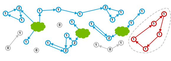 绿色的云代表的是程序中仍在使用的对象。从技术层面上来说,这有点像是正在执行的某个方法里面的局部变量,亦或是静态变量之类的。不同编程语言的情况可能会不一样,因此这并不是我们关注的重点。
