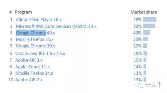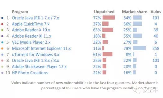 这份榜单的排列依据由两个参数构成:软件的市场占有率乘以未打补丁的比例(包括补丁已推出但用户未选择安装补丁的情况)。这份报告同时列出了从2014年4月到2015年3月将近1年时间里,这些软件被检测并暴露出来的漏洞数量。