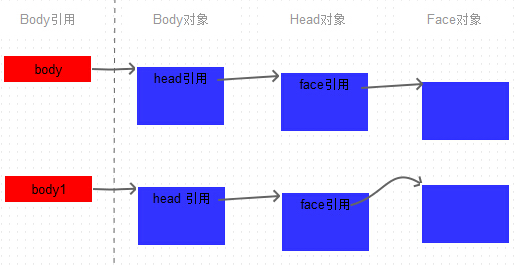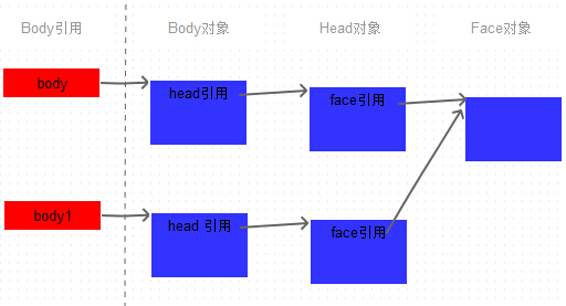 那么,对Body对象来说,算是这算是深拷贝吗?其实应该算是深拷贝,因为对Body对象内所引用的其他对象(目前只有Head)都进行了拷贝,也是说两个独立的Body对象内的head引用已经指向了独立的两个Head对象。但是,这对于两个Head对象来说,他们指向了同一个Face对象,这说明,两个Body对象还是有一定的联系,并没有完全的独立。这应该说是一种不彻底的深拷贝。