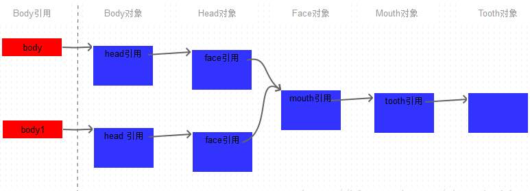 到此,可以得到如下结论:如果在拷贝一个对象时,要想让这个拷贝的对象和源对象完全彼此独立,那么在引用链上的每一级对象都要被显式的拷贝。所以创建彻底的深拷贝是非常麻烦的,尤其是在引用关系非常复杂的情况下, 或者在引用链的某一级上引用了一个第三方的对象, 而这个对象没有实现clone方法, 那么在它之后的所有引用的对象都是被共享的。 举例来说,如果被Head引用的Face类是第三方库中的类,并且没有实现Cloneable接口,那么在Face之后的所有对象都会被拷贝前后的两个Body对象共同引用。假设Face对象内部组合了Mouth对象,并且Mouth对象内部组合了Tooth对象, 内存结构如下图: