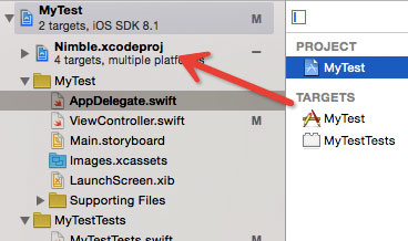 首先我们将 Nimble 库添加到项目中,并将 .xcodeproj 文件放到项目结构中: