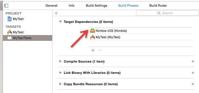 然后我们把 Nimble-iOS 作为测试 Target 的依赖库添加进来: