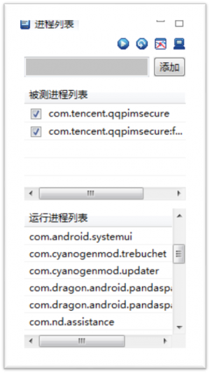 展示手机上运行的进程列表,双击或者添加到被测进程列表。