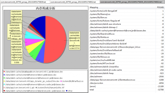可以同时选择2次内存快照打开,会计算增量内存的占比,如下图。可以发现两次快照间被测应用释放了21M的匿名内存映射。