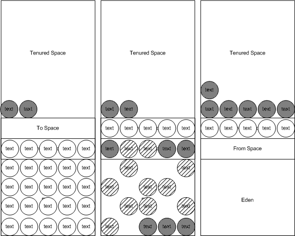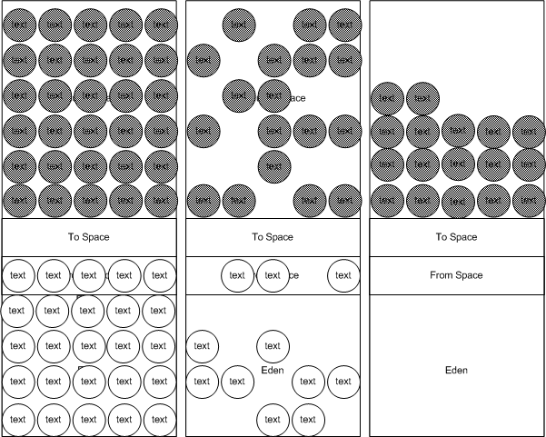 在次级回收中,内存主要分配到Eden空间直到将其填满。接着,拷贝收集器(copy collector)会将Eden中的活动对象拷贝到两个幸存者空间(survivor spaces, to space和from space)。遗留在Eden中的对象会被移除。如果幸存者空间被填满,但还有多余的活动对象,这些对象会被移到tenured空间。只有主要回收才能释放tenured空间的内存。