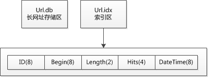 Url.db存储用户提交的长网址文本,Url.idx 存储数据索引,记录每次提交数据的位置(Begin)与长度(Length),还有一些附带信息(Hits,DateTime)。由于每次添加长网址,对两个文件都是进行Append操作,因此即使这两个文件体积很大(比如若干GB),也没有太大的IO压力。