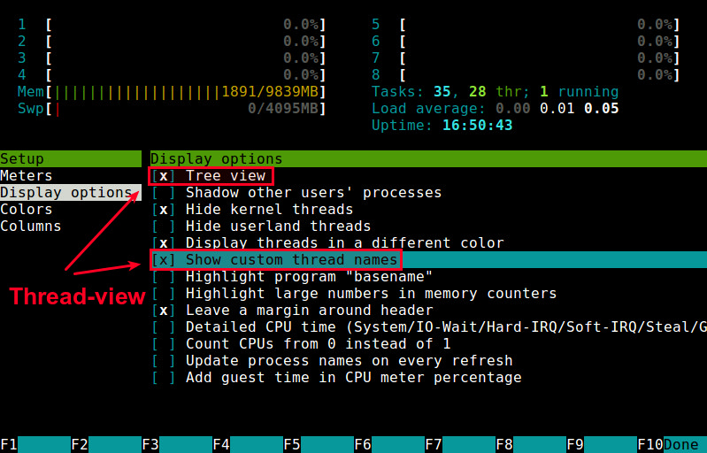 要在htop中启用线程查看,请开启htop,然后按<F2>来进入htop的设置菜单。选择“设置”栏下面的“显示选项”,然后开启“树状视图”和“显示自定义线程名”选项。按<F10>退出设置。
