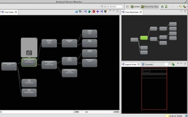Hierarchy View中有三个窗口。如果你在一个窗口中选择了一个View,那么它会在另外两个中高亮显示。你能同时使用这三个窗口查找View层级中的冗余视图。