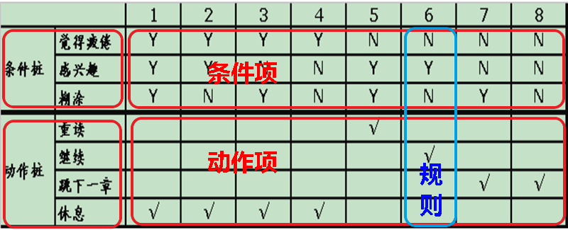 4)动作项(Action Entry):列出在条件项的各种取值情况下应该采取的动作。