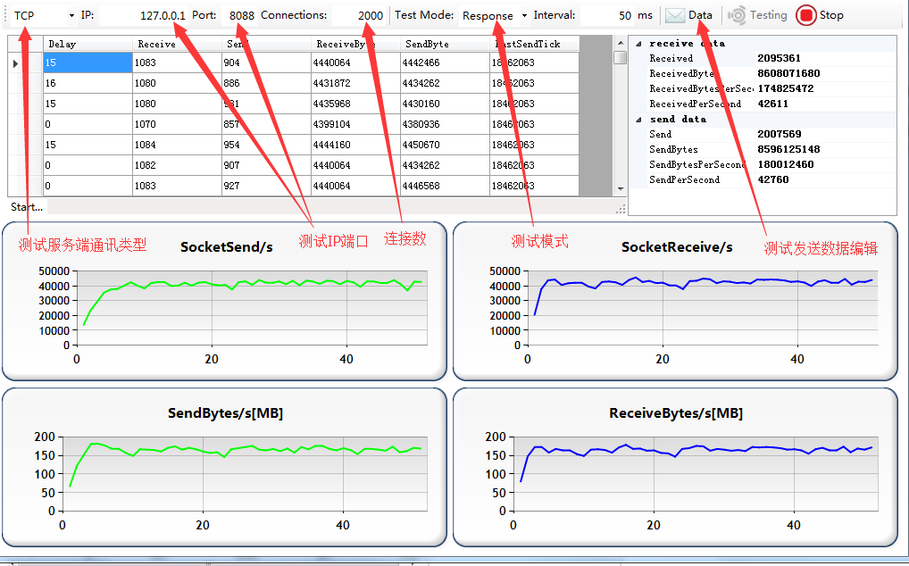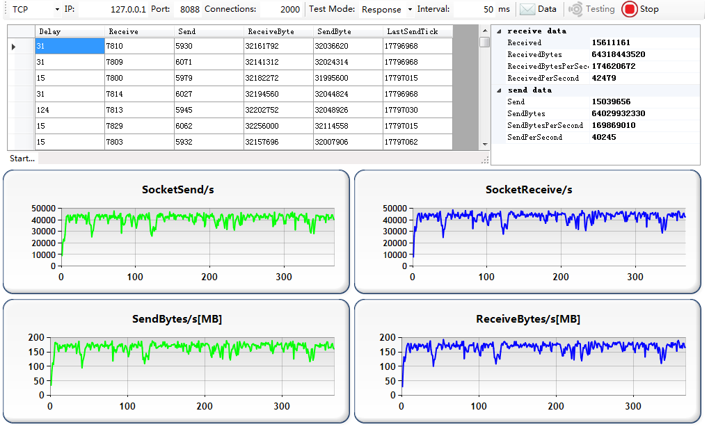 在编写一个网络服务的时候都比较关心这个服务能达到多少并发连接,而在这连接的基础上又能达到一个怎样的交互能力.编写服务已经是一件很花力气的事情,而还要去编写一个能够体现结果的测试工具更加消耗工作时间.下面介绍一个测试工具只需要简单地设置一下能对tcp/udp服务进行高并发和高吐吞的性能测试,并通过图形化的方式反映测试结果.