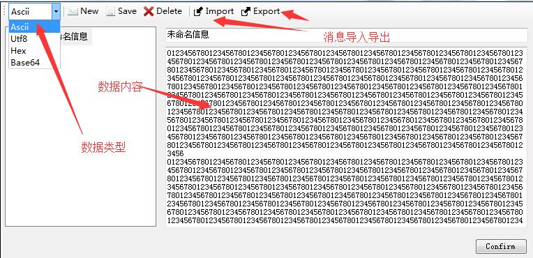 可以根据自己的需要编辑多发送的消息,每个连接都会轮遁把这些消息发送给服务端,消息的编码也可以根据自己需要设置.工具提供4种分别是:ascii,utf8,hex和base64.