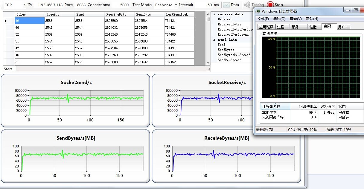 从结果来看5000个连接请求测试结果反映出整体交互是每秒6W个发送和6W个接收,而产生带宽上下行分别是60MB,那基本已经把测试环境1Gb的带宽跑完了.从系统的资源管理器来看的确是这样子.