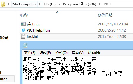 2.下载PICT工具后,进行安装。在安装目录下,新建txt文件,输入上述内容。