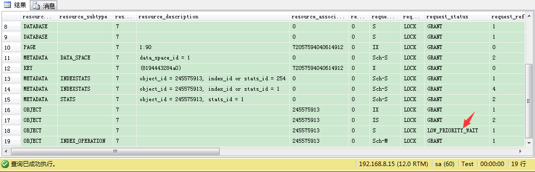 如果你在这里指定了BLOCKERS选项,那么阻塞的会话会回滚。当我们同时(在1分钟期间)查看DMV sys.dm_tran_locks,我们看到了有趣的东西: