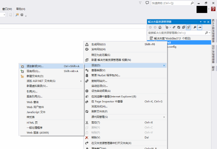 三、新建网站后你会看到解决方案管理器中看到一个web.config,待会我们可以通过配置这个文件来实现浏览器对WebService的远程调用。现在,右键解决方案中的项目名添加一个WebService项目。
