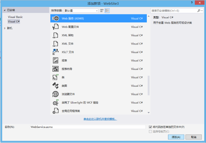 四、之后,你可以在项目模版中找到Web服务(ASMX),添加它!