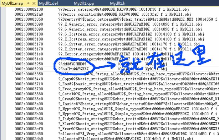 5.先把项目编译一遍,得到一个Mydll1.map文件,在这个文件里包括该dll文件成员函数的名字修饰