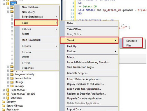 我们可以很轻易地使用SQL Server来创建一个数据库,创建的数据库实例将存储在指定的默认位置(不一定是C盘,可以手动变更默认存储位置)。假设此时数据库实例创建在了C盘中的默认位置,亦即是与数据库安装位置保持一致性,对于64位的操作系统来说,存储在C:Program FilesMicrosoft SQL ServerMSSQL11.MSSQLSERVERMSSQLDATA中。由于各种原因,我们的代码持续性在写数据库,数据库中LDF文件变得越来越大,而C盘的空间越来越小,此时,我们首先想到的是为数据库瘦身,瘦身很简单,右击数据库名称选择Tasks --> Shrink,如下图所示: