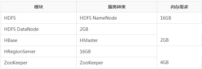 建议 HBase 的服务器内存至少 32G,表 1 是通过实践检验得到的分配给各角色的内存建议值。