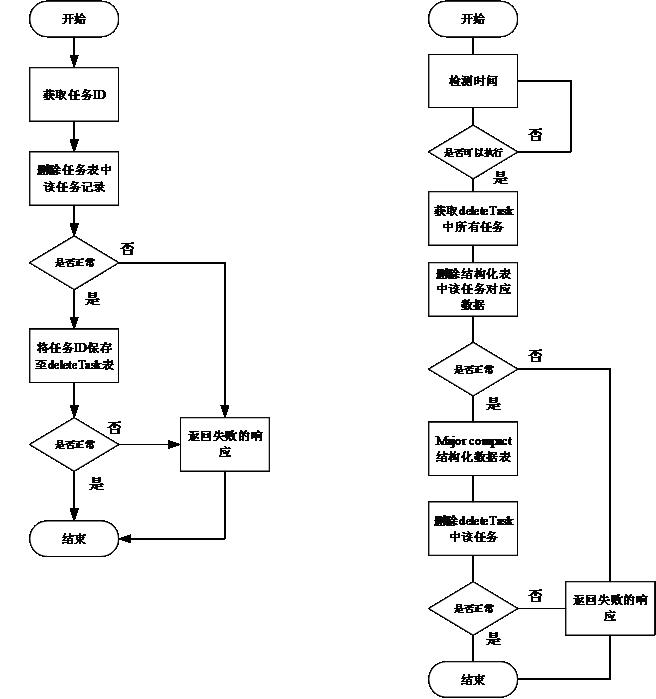 基于以上分析,我们必须重新考虑删除数据的流程。对用户来说,用户只要在检索时对于删除的任务不进行检索即可。那么只需要删除该条任务记录,对于该任务相关联的数据不需要立马进行删除。当系统空闲时候再去定时删除 HBase 数据表中的数据,并对 Region 做 Major Compact,清理已经删除的数据。通过对任务删除流程的修改,达到项目的需求,同时这种修改也不需要修改 HBase 的配置。