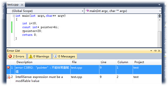 常量指针定义”const int* pointer=&a”告诉编译器,*pointer是常量,不能将*pointer作为左值进行操作。
