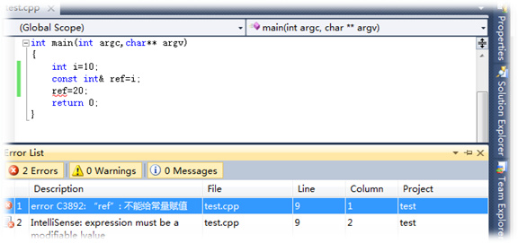而不存在所谓的”常量引用常量”,因为跟上面讲的一样引用变量是引用常量。C++不区分变量的const引用和const变量的引用。程序决不能给引用本身重新赋值,使他指向另一个变量,因此引用总是const的。如果对引用应用关键字const,起作用是使其目标称为const变量。即没有:Const double const& a=1;只有const double& a=1;