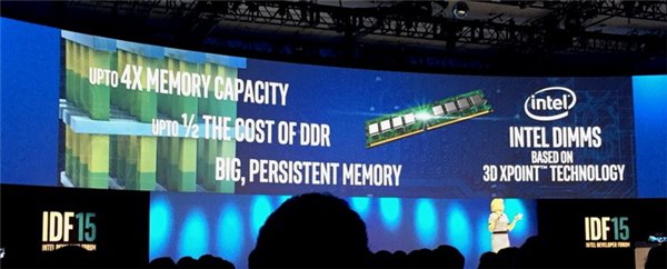 Intel在IDF会议上演示了SSD型的Octane硬盘,不过DIMM插槽型的Octane只有解说,没有演示。从Hardware.fr的报道来看,Intel提到DIMM型的3D XPoint内存比目前的DDR内存更有优势,成本只有DDR的一半,但容量可达DDR内存的4倍。