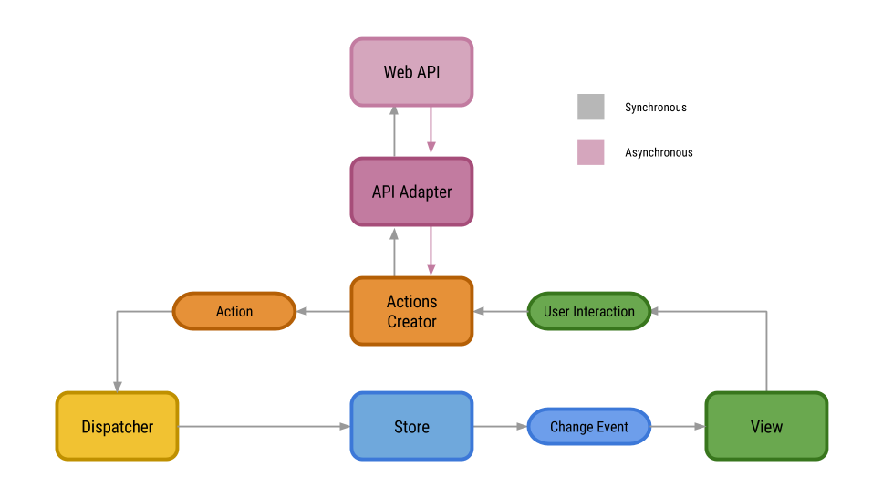 异步网络调用是被一个Actions Creator触发的。一个Network 适配器完成相应API的异步调用并且返回结果给Actions Creator。