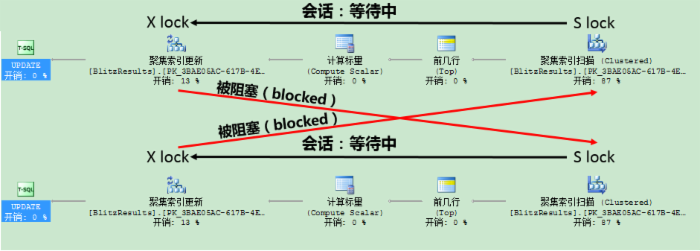 首先在更新查询计划里,更新锁用来避免死锁情形。假设在计划的第1阶段,有多个更新查询计划获得共享锁(Shared(S)Locks),然后在查询计划的第3阶段,当数据后被修改时,这些共享锁(Shared Locks)转化为排它锁(Exclusive Loks),会发生什么: