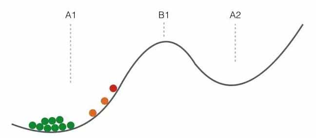 很多团队是处于 A1 状态,都期待着往耗子说的 B1 而去。我们真正要解决的问题,是如何带领团队从 A1 波谷,到达耗子描绘的 B1 波峰。除了合理分工、团队间的彼此赋能、以及土到的技术突破,还需要重视一个规律性: