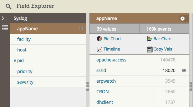 用日志管理系统自动解析日志,然后在需要的应用名称上点击过滤。下面是在 Loggly 日志管理服务中提取 syslog 域的截图。我们对应用名称 “sshd” 进行过滤,如维恩图图标所示。