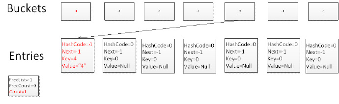 根据Hash算法: 4.GetHashCode()%7= 4,因此碰撞到buckets中下标为4的槽上,此时由于Count为0,因此元素放在Entries中第0个元素上,添加后Count变为1