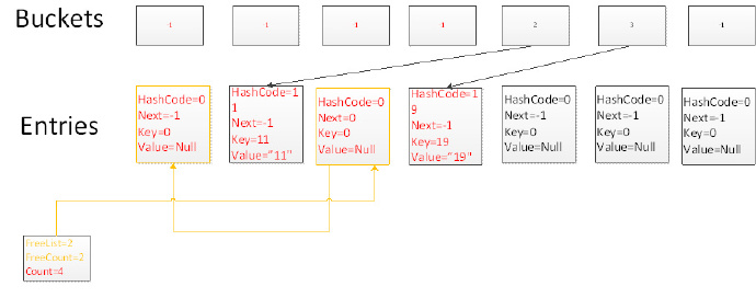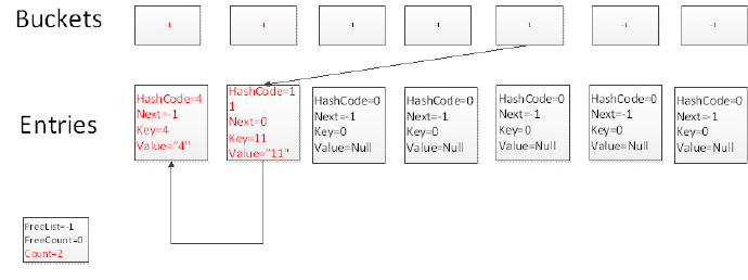 根据Hash算法 11.GetHashCode()%7=4,因此再次碰撞到Buckets中下标为4的槽上,由于此槽上的值已经不为-1,此时Count=1,因此把这个新加的元素放到entries中下标为1的数组中,并且让Buckets槽指向下标为1的entries中,下标为1的entry之下下标为0的entries。